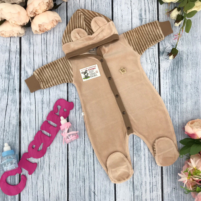 Теги: Купить велюровый комбинезон оптом от производителя. 225. Комбинезон с шапкой, 80% хлопок велюр, 20% ПЭ 56,62,68,74 цена,отзывы официальный сайт "Стеша Астрахань"